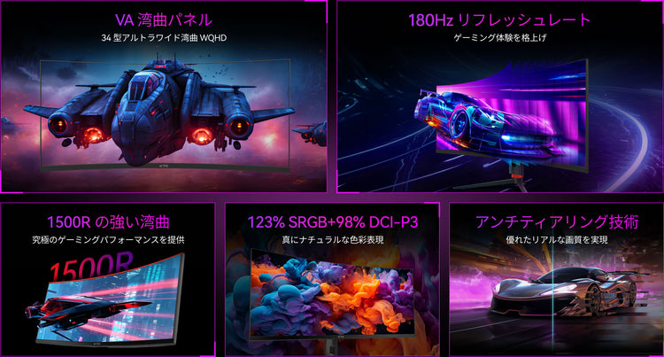 【34 型 1500R 湾曲 VA パネル】視野を包み込むような没入感を実現し、細部まで集中してプレイできます。
